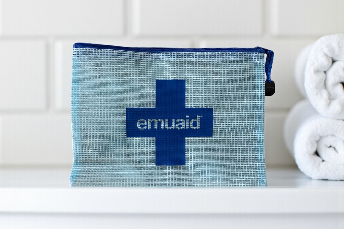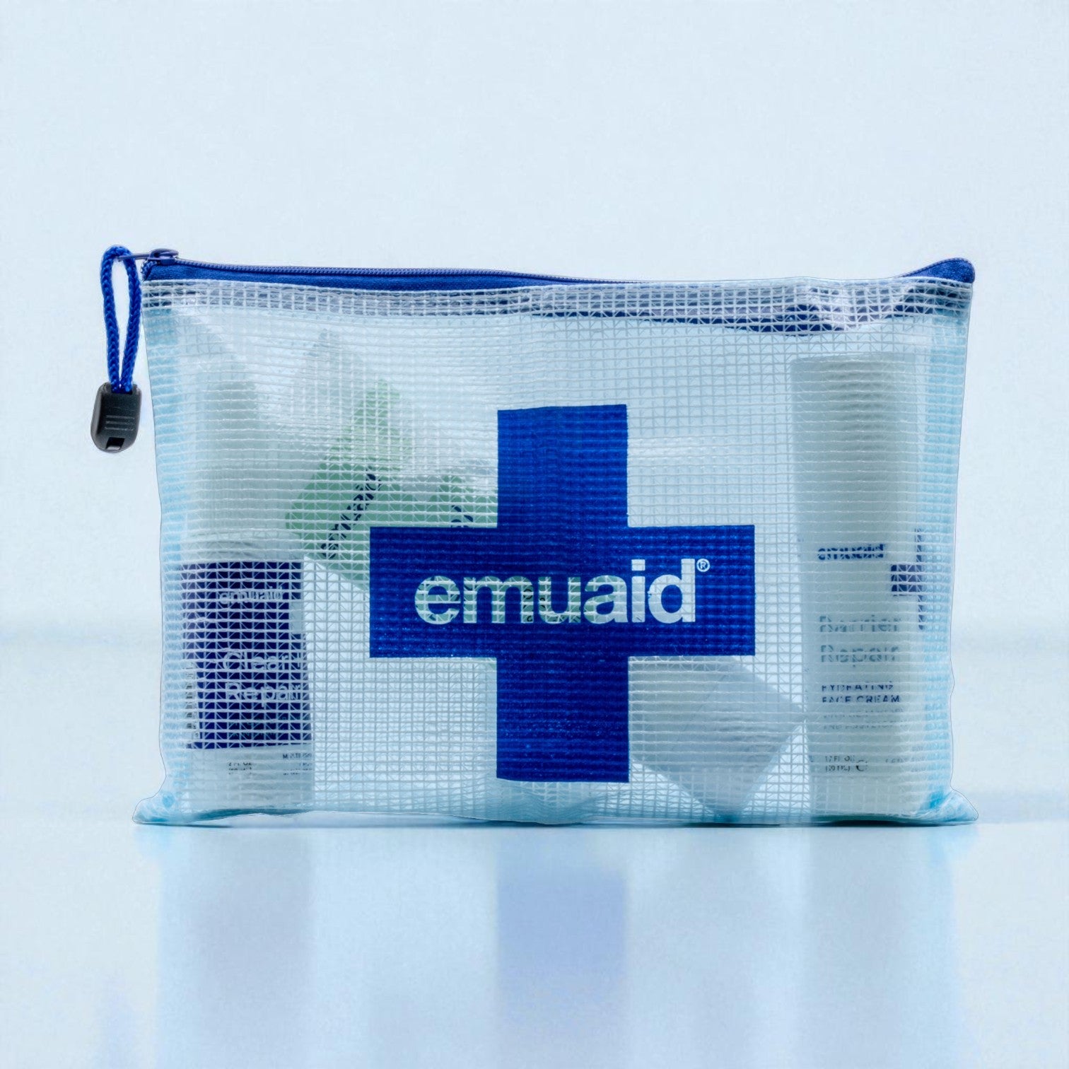 Nuestra bolsa de malla personalizada lista para viajar, perfecta para llevar sus productos EMUAID favoritos a todas partes.